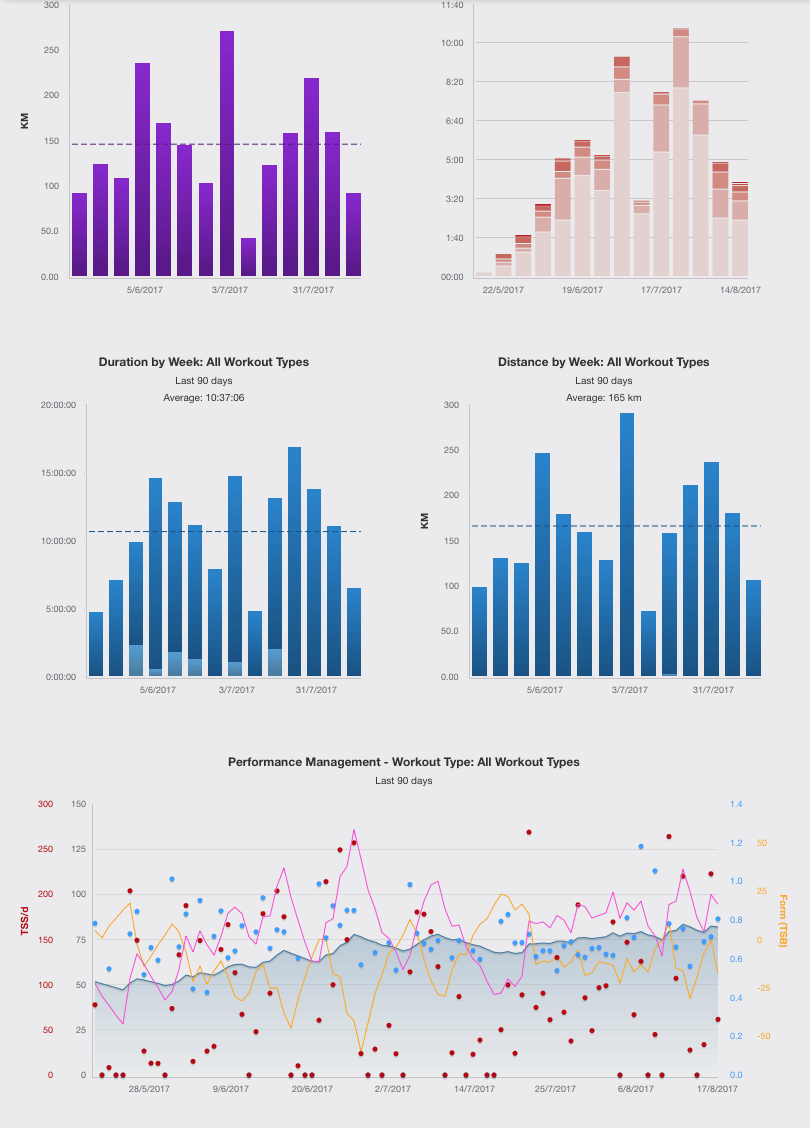Below are some sample screens that we can use to track your progress towards your race goal. The key chart is the Performance Management Chart (PMC) which shows your overall level of fitness and most importantly your fatigue levels.